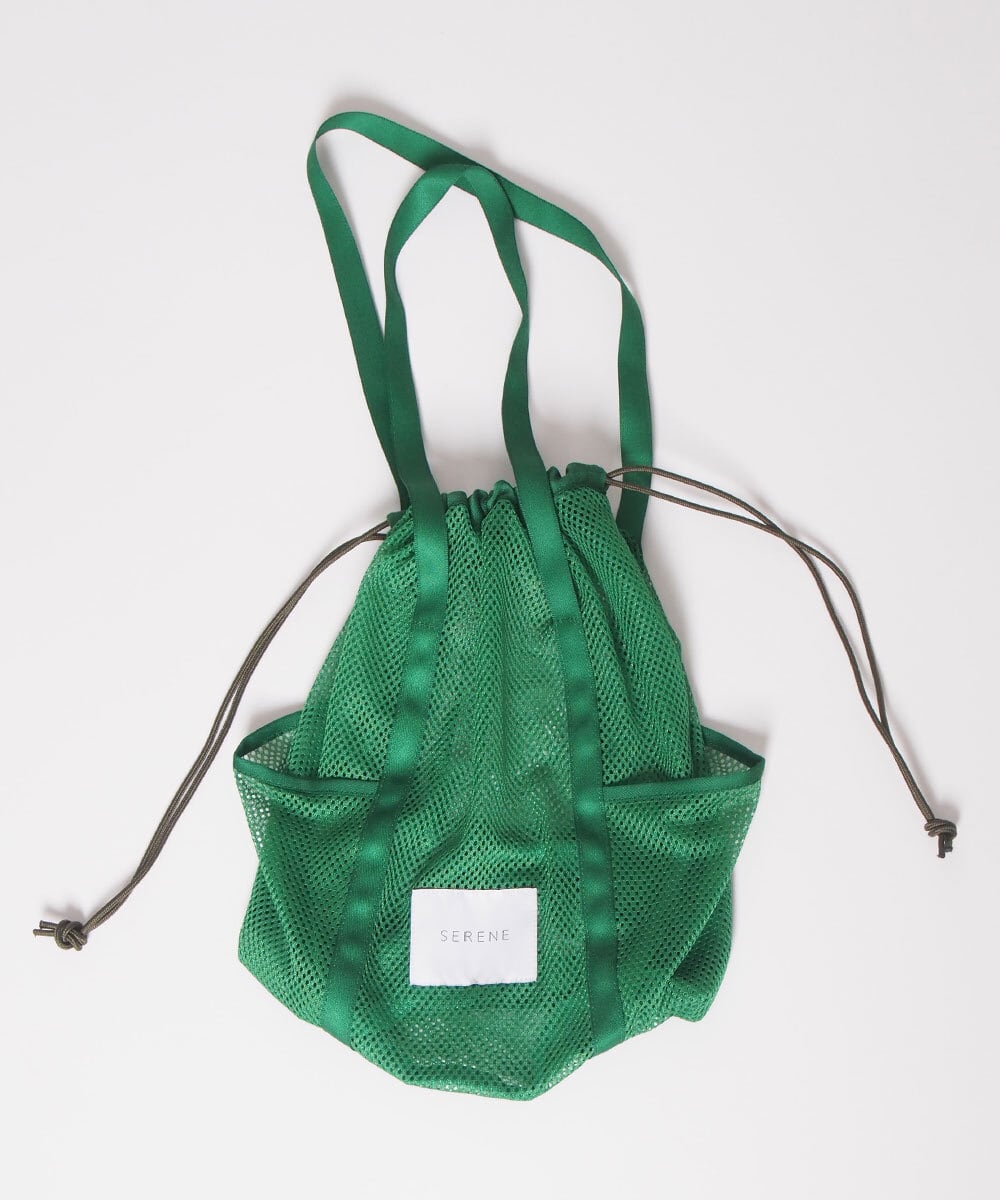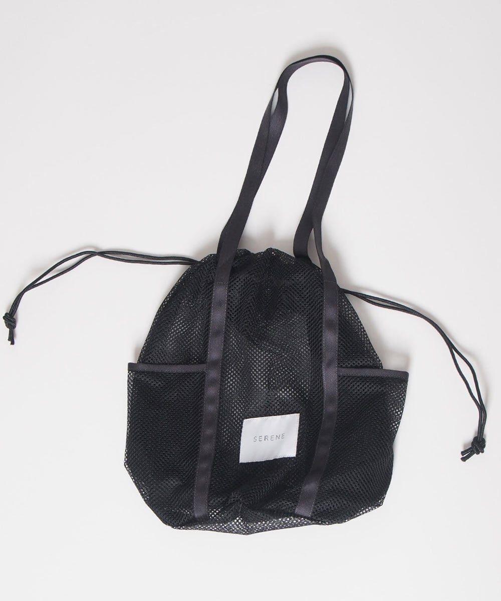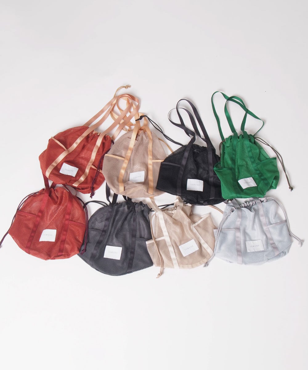 お仕事の前や後に手持ちのバッグの中にこのメッシュバッグにウェアを忍ばせたり、サブバッグとしてもったり。汗をかいたウェアを入れても蒸れず、そのまま洗濯機へ入れてランドリ―ポーチとして使用できるように作成。サイドにポケットとハンドルも長めに作り機能的にファッションに馴染むようおつくりしています。